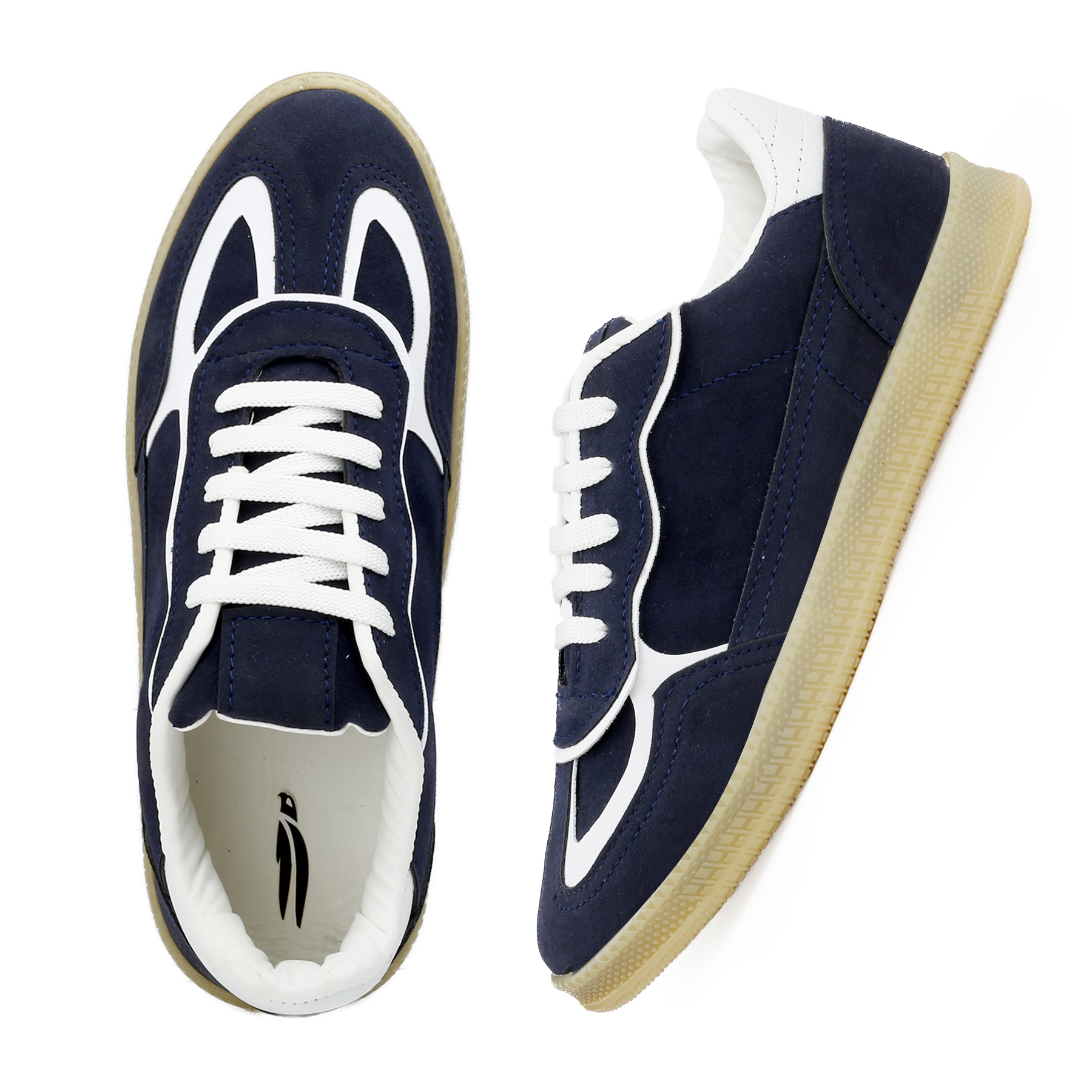 Sleek navy blue sneakers with white detailing and a gum sole. Lightweight, comfortable, and perfect for casual or everyday wear.